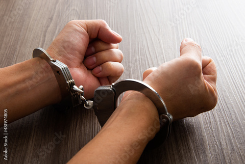 Arrested criminal hands locked in handcuffs.