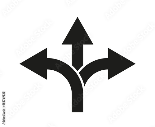 Arrow way with three options of road icon. Choice of pathway. Choose of decision in split of direction. Crossroad, uncertainty and choice opportunity. 3 directions on junction. Vector