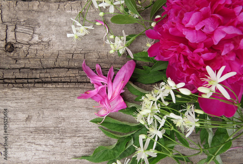 Art flower background . Beautiful photo peony flower on a wooden background. Place for text.