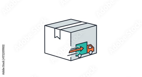 Art Icon of a Cardboard with a Delivery Truck and Arrow, Symbolizing Shipping and Logistics for E-commerce and Fast Delivery Services