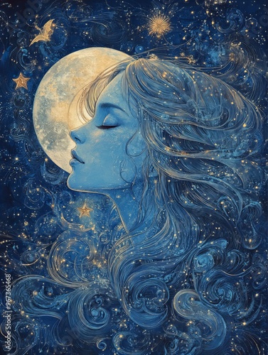 Art Nouveau portrait of a young woman illuminated by the full moon in serene twilight setting new beautiful stock image illustration AI