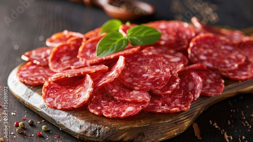 Artfully arranged salami slices with basil on a rustic wooden board.