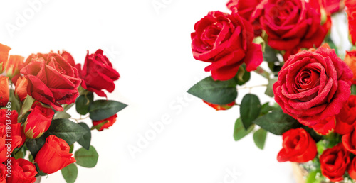 Artificial flowers Red flowering rose bush as frame border isolated on white background included. suitable for graphic projects Card Banner Valentine, Love, Wedding.