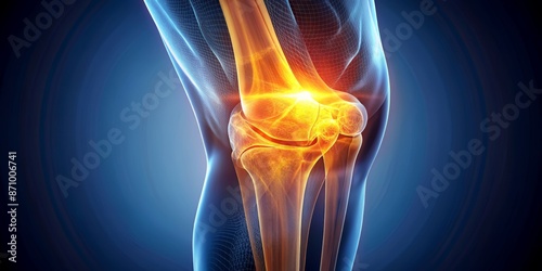 Artificial intelligence (AI) close-up image of a human knee with an orange bioluminescent glow