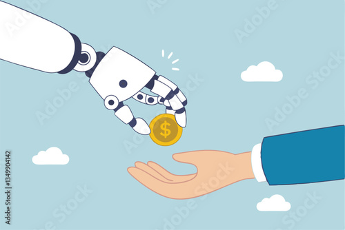 Artificial intelligence AI make money, data licensing resource for AI training payment, automation investment, robot trading or banking concept, AI robot hand giving dollar money to businessman.