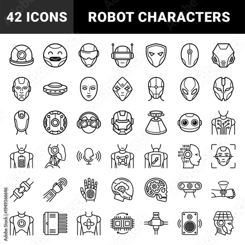 Artificial intelligence and robotic engineering elements for technical documentation. Precise monoline pictograms featuring android heads and cybernetic components.