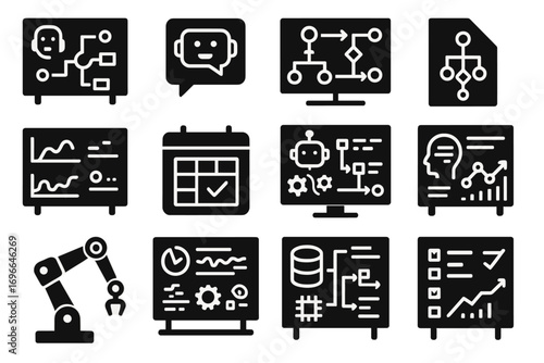 Artificial intelligence solid icon set. ai technology, automation, machine learning symbols