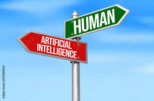Artificial Intelligence Vs Human written on a signboard with green and red color, blue sky in the backdrop. Human vs AI concept design background