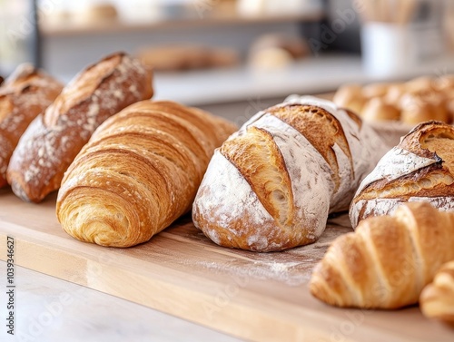 Artisan Bread and Croissants on Wooden Board