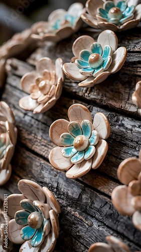Artisan ceramic flower blossoms affixed to rustic textured wooden surface
