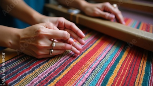 Artisan Hand Weaving Vibrant Multicolored Fabric – Traditional Textile Craftwork Close-Up