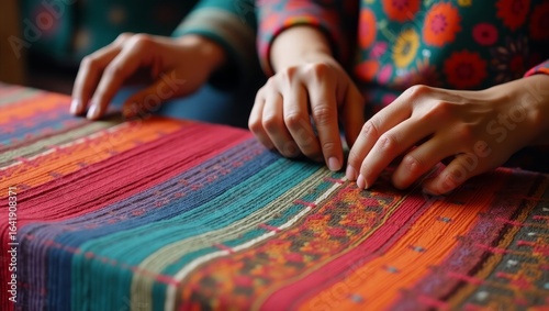 Artisan Hand Weaving Vibrant Multicolored Fabric – Traditional Textile Craftwork Close-Up
