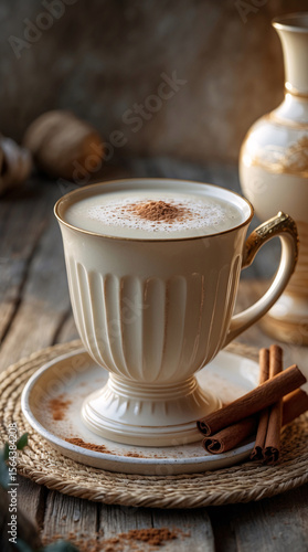 Artisan Wooden Table With Coffee Milk In Glass On Boho Morning Interior Vintage Kitchen Scene drink aesthetic photography wallpaper background