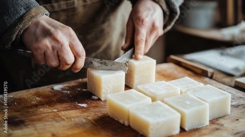 Artisanal soap maker meticulously cuts homemade bars on a wooden surface