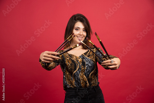 Artist girl demonstrating her set of new brand brushes and looks satisfied