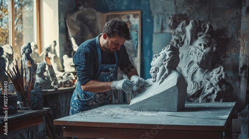Artist Sculpting a Concrete Piece in Studio
