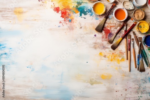 Artist workbench showing brushes, colorful paints, and splashed pigments on a white wooden background