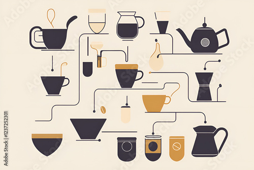 Artistic coffee brewing diagram featuring various coffee-making equipment and techniques