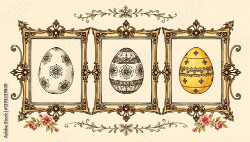 Artistic Easter Trio: An intricately detailed depiction of three ornately decorated eggs, each encased within a delicate vintage frame, offering a sense of tradition and artistic beauty.