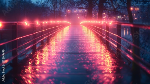 Artistic Evening Light Experiment on a Sleek Metal Bridge with Serene River Reflections and Creative Vibes