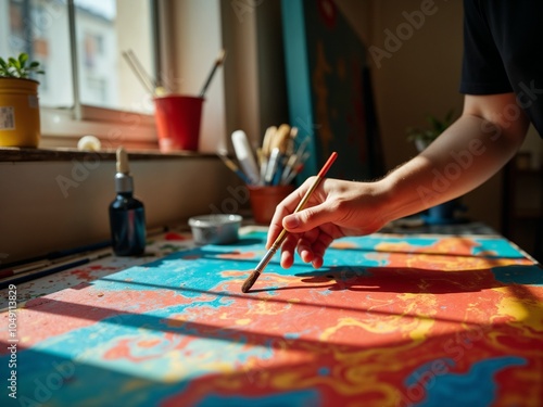 Artistic Expression: Close-Up of a Hand Painting a Vibrant Abstract Canvas in a Creative Studio