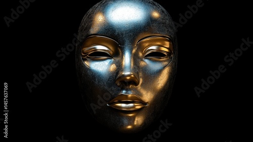 Artistic golden and silver metallic face mask showcased against a dark background highlighting intricate details and textures