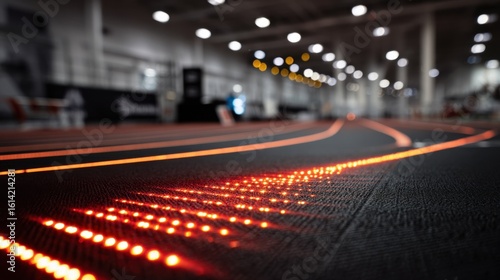 Artistic medium shot of illuminated pacing strips aligned on an indoor track crisp in focus while the surrounding area remains out of focus illustrating advanced technology