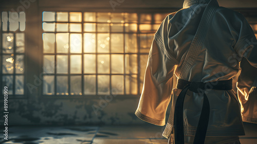 Artistic photo of karate gi over training dummy with softly lit dojo background