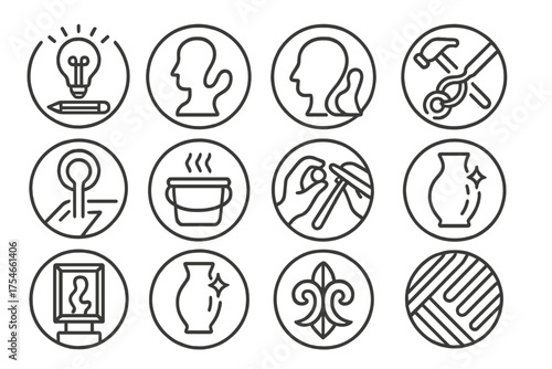 Artistic Process Icons. Line style round icons of artistic process: idea sketch, concept form, tool setup, hotwork; cooling,