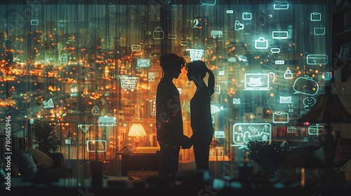 Artistic rendering of a couples silhouette against a backdrop of a digital marketplace with icons and goods floating around them