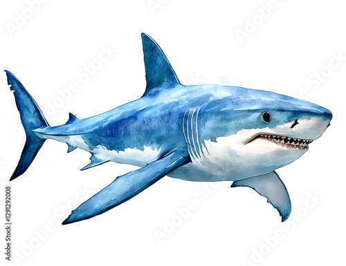 Artistic representation of a great white shark in a dynamic underwater setting
