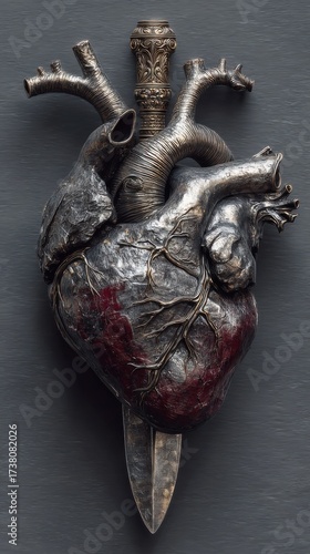 Artistic representation of a heart with a sword, blending anatomical and symbolic elements in a dramatic display