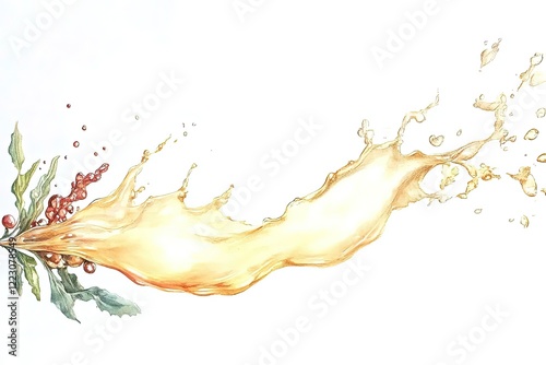 Artistic splash of liquid with leaves and bubbles, symbolizing freshness and vitality