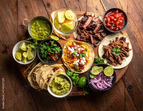 Artistic wide shot of a bustling taqueria scene, foreground features a beautifully plated Tacos al Pastor, background subtly blurred with warm ambient lighting, rich color grading, cinematic compositi
