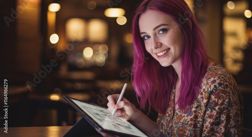 Artistic young woman illustrating on tablet in cozy cafe setting