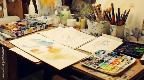 Artist's workspace with watercolor paints, brushes, and sketches.
