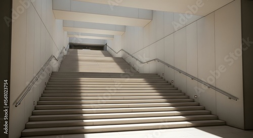 Ascending interior staircase with sunlight casting long shadows concrete walls and handrails leading toward an unknown destination light and shadow perspective.