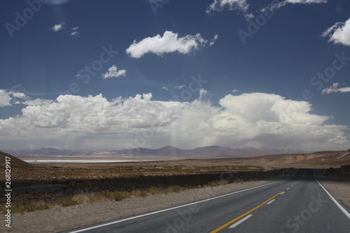 asfaltowa droga prowadząca do wielkiej solnej równiny w argentynie z andami i niebem w tle