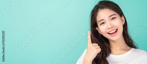 Asian beautiful woman pointing one hands with finger on upper side with smile face on pastel background in studio. copyspace and presentation concept