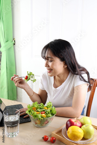 Asian Beauty Woman Eating Green Healthy Salad While Watching FIlm on Tablet Computer