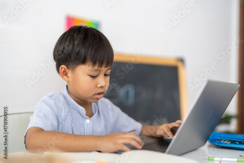 Asian boy using laptop with course online learning, distance education for kids, e-learning at home, child studying digital technology, interactive education platform, remote class tutorial