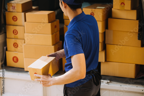 Asian business men use laptop computer checking customer order online shipping boxes at home. Starting Small business entrepreneur SME freelance