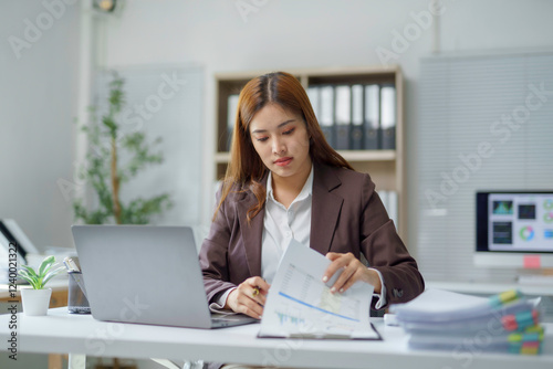 Asian businesswoman analyzing financial documents and working with laptop at office desk
