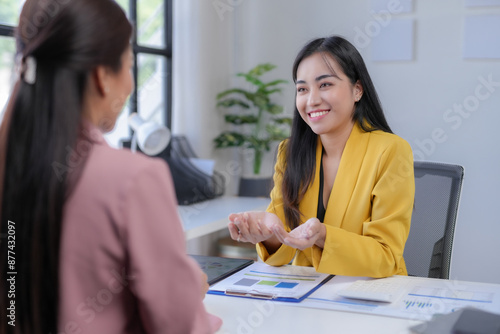 Asian businesswoman and colleague collaborating on financial strategies in a dynamic office. Analyzing data on computer screens with teamwork and confidence
