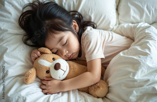 Asian child peacefully sleeps in bed hugging plush dog toy. Sweet dreams under soft white blanket, comfy mattress and clean pillow. Healthy nap for little girl.