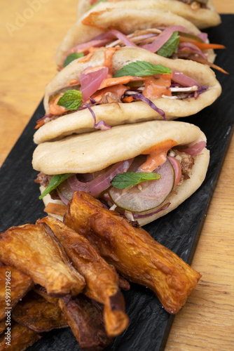 Asian cuisine. Closeup view of pulled pork baos buns with pickles, sauce and fried sweet potatoes, in a black dish on the wooden table.