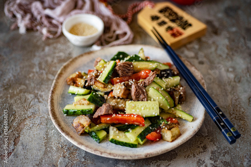 Asian cuisine: salad with beef, cucumbers and pepper for lunch. Salad with vegetables on a plate on a gray background. Close-up