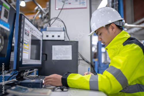 Asian electric engineer holding clipboard for checking and monitoring the electrical system in the control room,Technician thailand people working