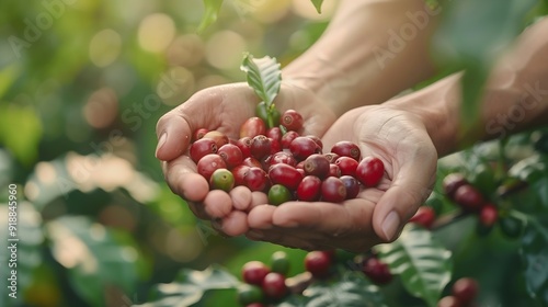 Asian farmer showing picked red coffee beans in hands Woman farmer is harvesting coffee in the farm arabica Coffee plantation Coffee beans on tree : Generative AI
