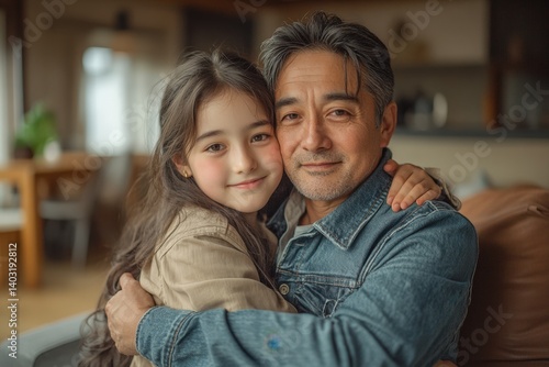 Asian Father and Daughter Hugging on Happy Father's Day in Living Room Photo.Fictional Character Created By Generative AI